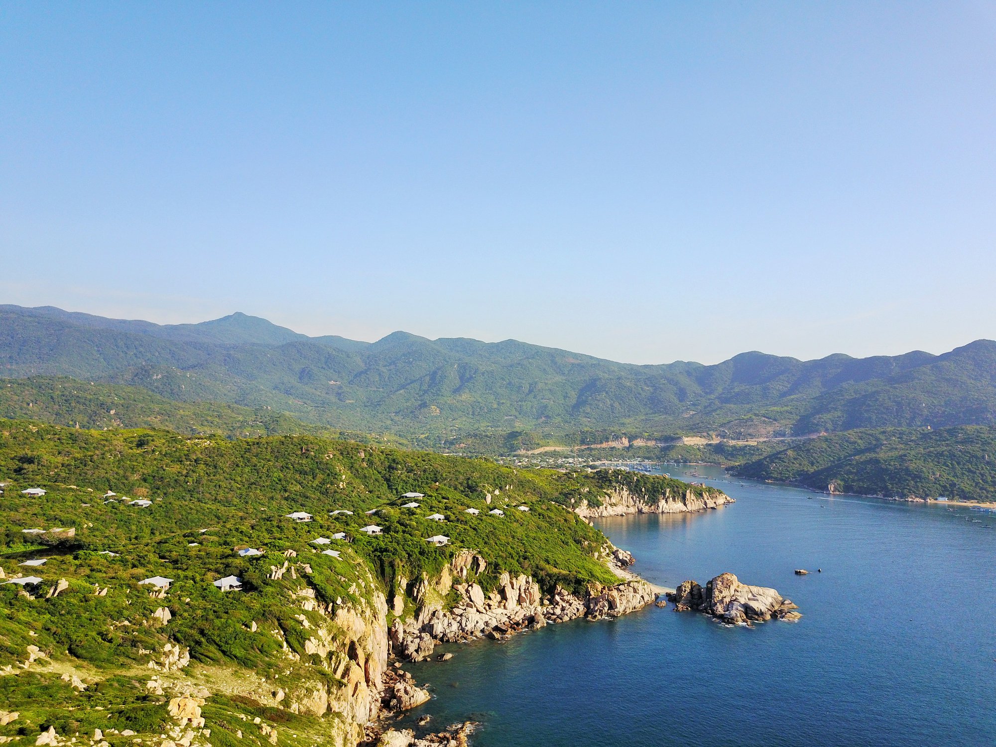Resort nằm trên vịnh Vĩnh Hy, nơi có phong cảnh hoang sơ, thiên nhiên rừng rậm hòa quyện với làn nước trong veo tạo nên một không gian say đắm lòng người. Không gian dành trọn cho những bạn thích phiêu lưu hay sự yên bình, thanh thản. Bạn có thắc mắc là đây là một khu nghỉ dưỡng đẹp như thế tại sao biển ở đây lại hoang sơ chứ không phải thơ mộng không? Thật ra, khu nghỉ dưỡng thường được lựa chọn và xây dựng ở nơi yên tĩnh nhưng vẫn phải đẹp, vì thế hay được xây dựng gần biển. Còn bãi biển này mang đến một vẻ đẹp hoang sơ là bởi vì chưa có nhiều các dịch vụ du lịch được phát triển nên nó vẫn giữ nguyên vẻ đẹp, bản chất mà nó đang có. Nó mang đến một vẻ đẹp hoang sơ, yên bình chứ không phải không mang đến vẻ đẹp.