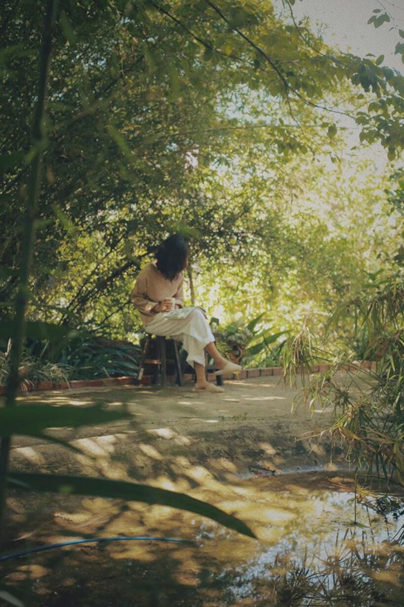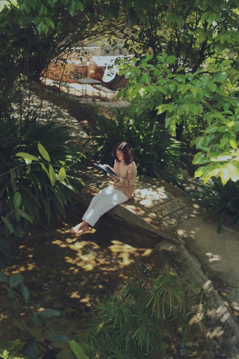Bước qua chiếc cổng sắt “khó tính” ấy rồi bạn sẽ thấy cả 1 khu vườn xanh ngát cùng hồ nước nhỏ chạy uốn quanh. Khung cảnh sân vườn này quả là background sống ảo tuyệt vời cho bất cứ ai thích concept hòa nhập với thiên nhiên đó nha.