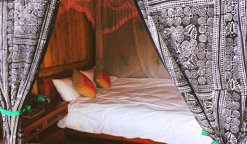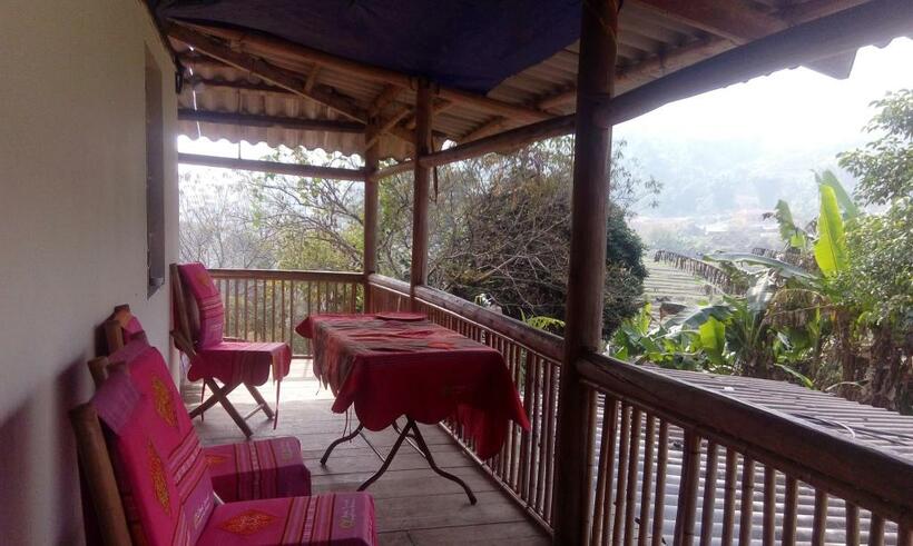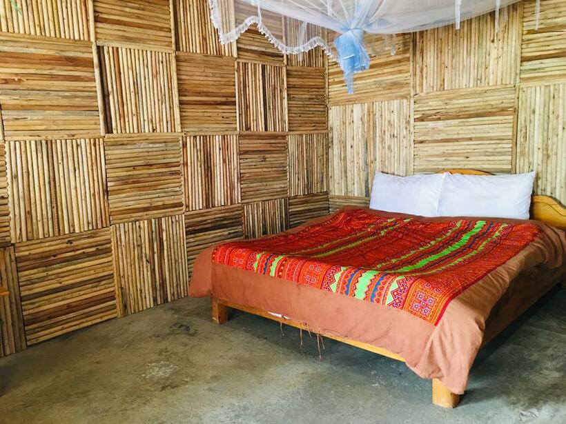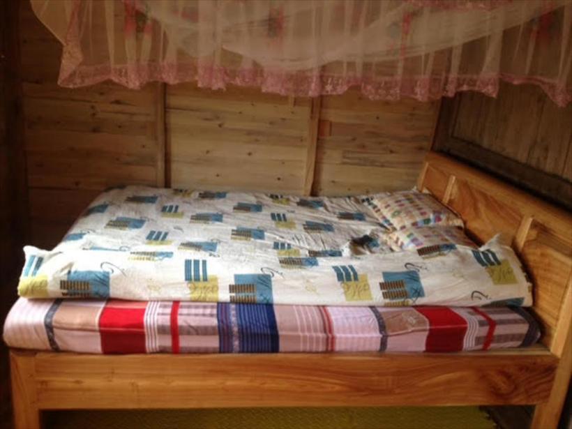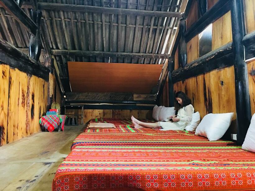Không gian nghỉ dưỡng ở đây được thiết kế theo lối mở và ngăn cách bằng rèm che sạch sẽ. Trên tầng 2 có riêng một khu ban công rộng rãi, từ đó, bạn có thể phóng tầm mắt ngắm bản làng và núi rừng xa xa.